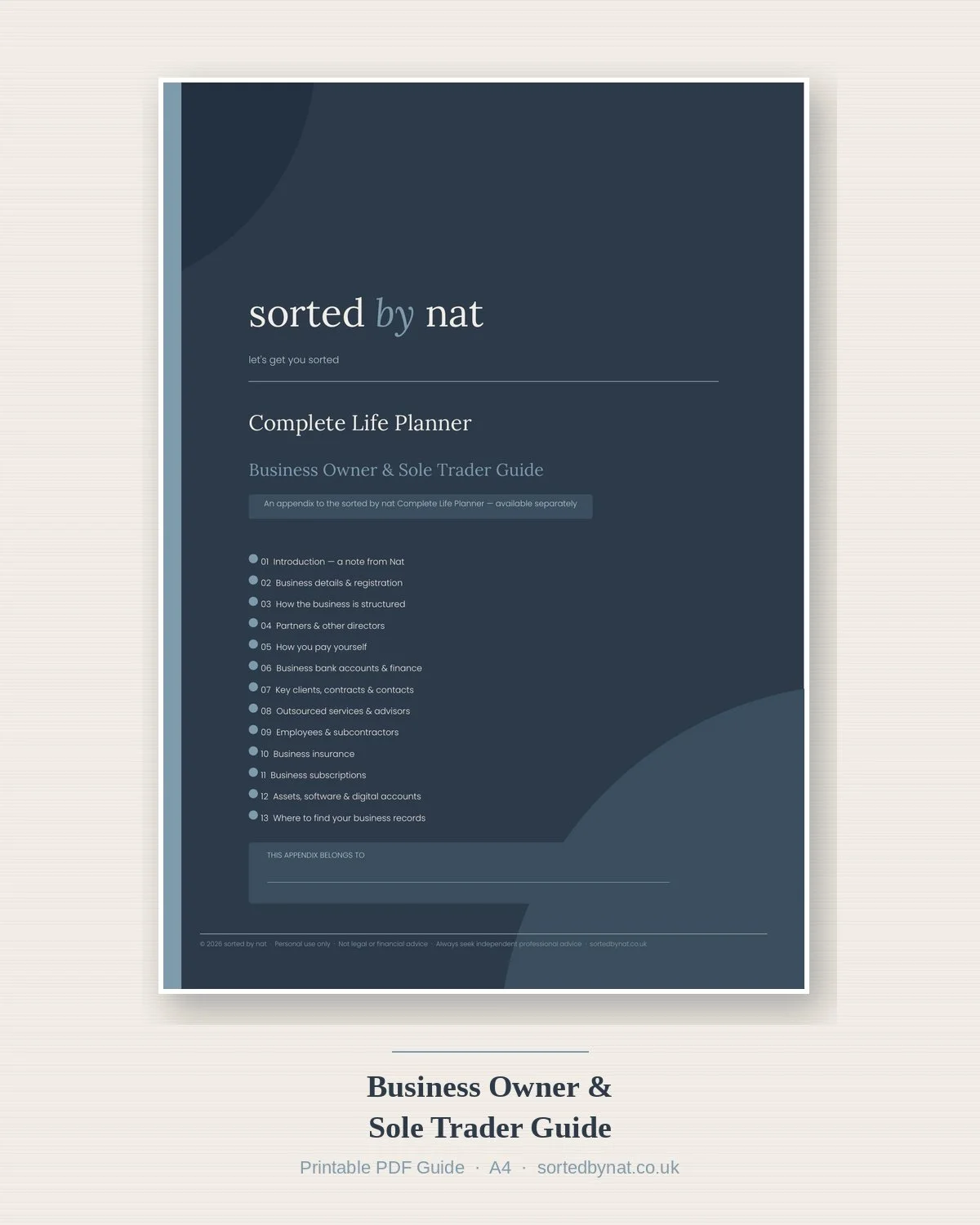 **Designed as an additional section for the complete life planner if you have your own business, note this does not include The Complete Life Planner ** Business Owner & Sole Trader Guide Everything your executor needs to know about your business — so nothing falls through the cracks. If you run your own business — as a sole trader, limited company director, partner or contractor — your affairs are significantly more complex than an employee’s. Your executor may have no business experience at all. Without a clear record, they could find themselves trying to manage clients they don’t know, accounts they can’t access, and contracts they don’t understand — at exactly the wrong moment. Money owed to you could be lost. Staff could be left without pay. Decisions that should have been yours to make could end up being made by someone with no context. This guide is designed to sit alongside the Life Planner as a dedicated record of everything your executor would need to know about your business. Work through it at your own pace. The more you fill in, the more valuable it becomes. What’s inside — 13 sections covering: • Business details & registration — trading name, UTR, Companies House number, VAT, PAYE reference • How the business is structured — sole trader, limited company, partnership or LLP • Partners & directors — contact cards for anyone else who has a stake or role • How you pay yourself — salary, PAYE, dividends, drawings, director’s loan — recorded clearly • Business bank accounts & finance — where the money lives and who can access it • Key clients, contracts & contacts — the relationships your executor will need to manage or close • Employees & subcontractors — who works for you and what they’re owed • Business insurance — professional indemnity, public liability, key person cover • Business subscriptions — software, tools and recurring costs that need to be cancelled or continued • Assets, software & digital accounts — what you own, what you licence, and where to find it • Where to find your business records — accountant details, filing locations, Companies House access • Outstanding invoices & debts — money owed to you and money you owe Perfect for: Sole traders, limited company directors, freelancers, contractors, and anyone who runs their own business and wants their executor to be able to manage it properly. Format: A4 PDF, 15 pages, print-ready. Designed to complement the Life Planner — or work as a standalone record.